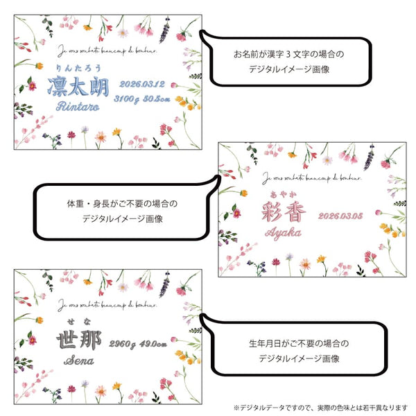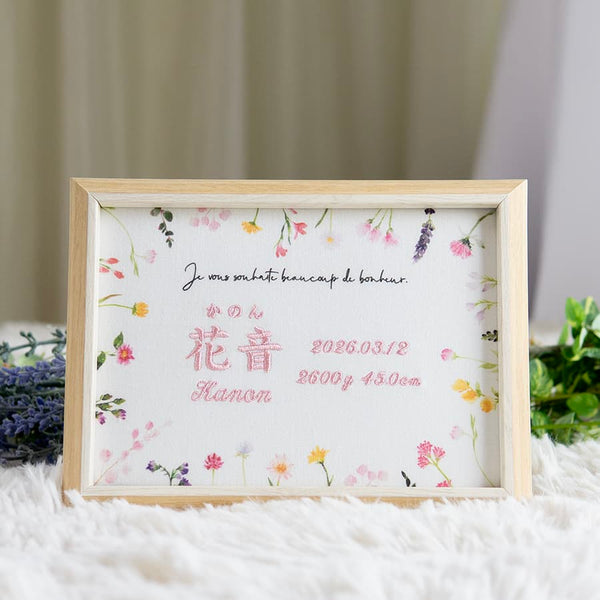 お名前の周りには、お子様を祝福するように水彩画のような手描き風の色とりどりのお花たちと「たくさんの幸せが訪れますように」という意味の「Je vous souhaite beaucoup de bonheur.」というフランス語のメッセージがアクセントになったデザインをプリントでお入れします。