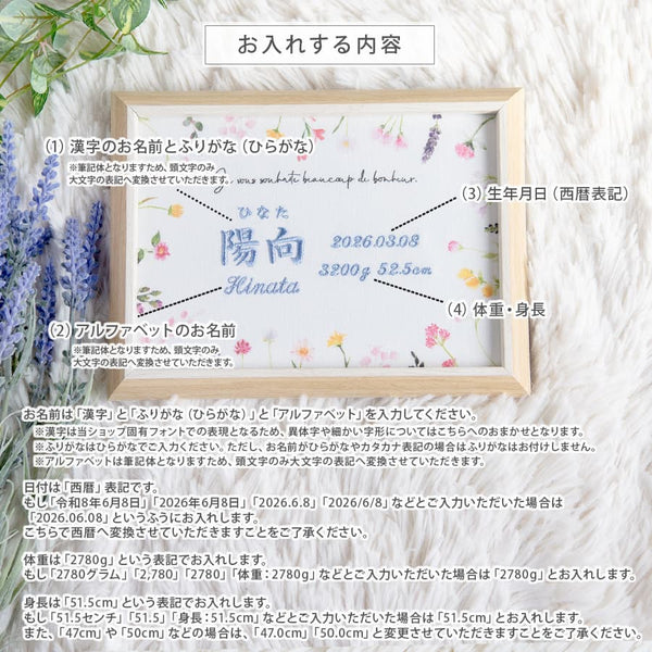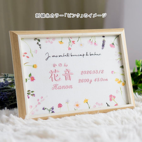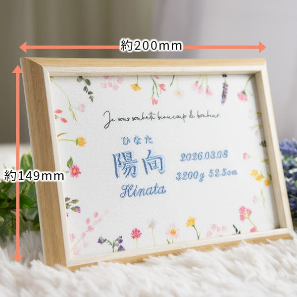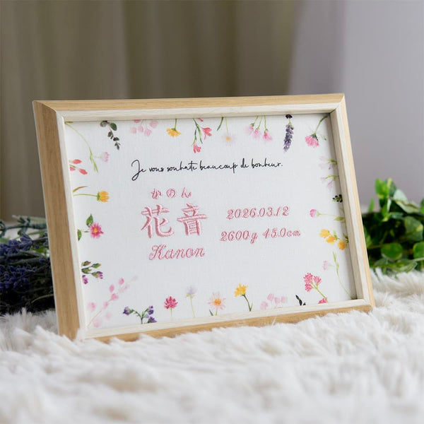 可愛いお花と刺繍でお入れするお名前がとってもおしゃれな命名書です。
